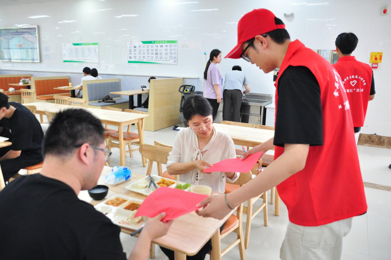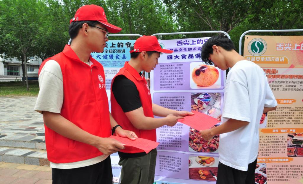 5月23日,学院将活动延伸至教职工餐厅。活动现场,关于食品安全的易拉宝依旧有序摆放,志愿者结合专业知识,对过往教职工及学生讲解食品安全知识,尤其针对夏季食品存放问题做出细致解答。随后,志愿者走进餐厅,为工作人员派发食品安全传单,并送上寓意吉祥的五彩绳,让大家在学习知识的同时,感受到浓浓的端午节日关怀。宣讲临近尾声,志愿者与在场教职工、学生共同喊出“外卖图快捷,健康需警惕”的口号,呼吁大家重视食品安全问题。