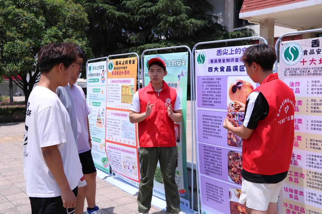5月20日中午,枫园小广场的活动现场热闹非凡。一系列关于食品安全的易拉宝整齐陈列,内容涵盖生活中四大有害食物、四大食品误区以及十大垃圾食品等,以图文并茂的形式直观地向师生传递食品安全实用知识。志愿者们结合易拉宝内容,对食品安全知识进行详细讲解,并主动为过往师生派发传单。活动中,同学们积极互动、踊跃提问,对十大健康食品的营养知识、选购技巧展现出浓厚兴趣。