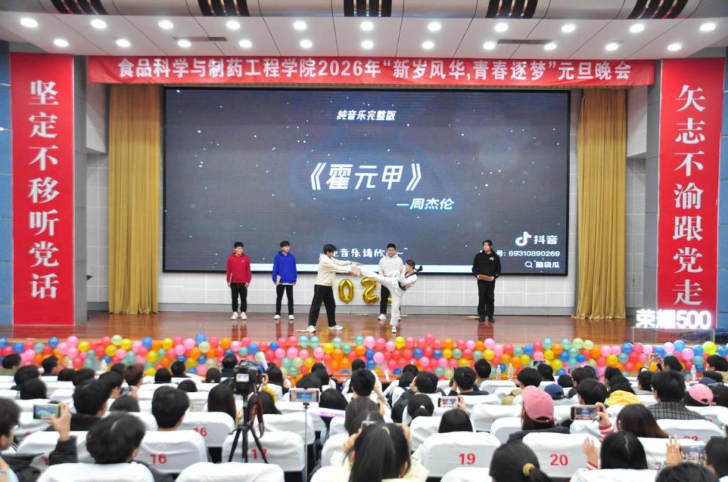 晚会以“新岁序章起风华,青春逐梦绽光彩”为核心主题,精心设置“青春织梦·声色流光”“青春展卷·艺韵绽放”“青春赴远·光彩满途”三个篇章,节目形式多元、内容精彩纷呈,从动感演绎到温情告白,从诙谐互动到精神共鸣,每一个环节都紧扣主题,点燃全场热情。晚会伊始,动感旋律便瞬间打破现场宁静——《陷阱》的深情吟唱刚落,《公路之歌+鲜花》的强劲节奏便接续登场,饱满的歌声裹挟着青春张力,瞬间点燃全场气氛,正式拉开晚会帷幕。紧接着,不齐舞团带来的青春舞蹈活力四射,舞步轻快灵动,尽显学子朝气;一段rap串烧更是以娴熟的舞台表现力嗨翻全场,台下掌声、欢呼声此起彼伏;随后登场的武术表演飒爽利落,一招一式刚劲有力,将中华武术的魅力展现得淋漓尽致,一连串精彩节目让现场热度持续攀升。