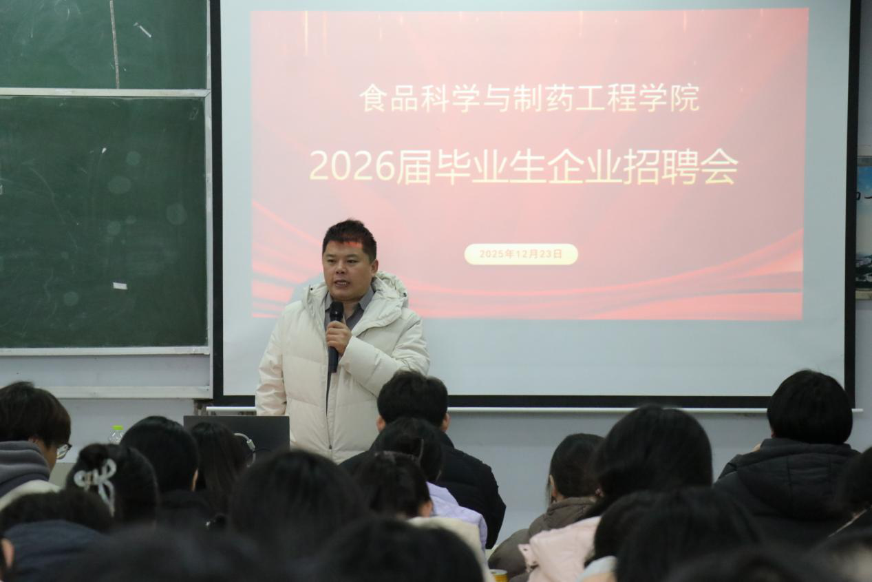 为进一步加强校企合作力度,提升毕业生就业质量,我院于12月23日在文科楼117教室诚邀康师傅控股有限公司来我院做招聘宣讲。本次宣讲会由康师傅控股有限公司人力资源部主管赵亮经理主讲,学院全体食品相关专业2026届毕业生学生参加本次活动。