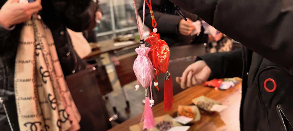 活动精准对接社区需求,将专业实践、文化传承与社区服务紧密结合,涵盖普法宣传、药食同源科普、中草药识别、香囊制作、春联送福等多个环节。志愿者通过现场讲解、案例分析以及发放宣传手册等形式,用通俗易懂的语言向居民普及《中华人民共和国食品安全法》以及反诈知识、消防安全等相关法律法规,提升了社区居民的法治意识和安全防范能力,引导大家学法、守法、尊法、用法,营造良好的社区法治环境。随后,志愿者系统讲解“药食同源”的文化渊源、核心理念及日常应用,让居民在轻松氛围中掌握科学食养知识,认识到日常饮食与健康密不可分,在平安健康中迎接新春佳节。接着,志愿者发挥专业优势为居民细致讲解讲授薰衣草、桂枝、艾草、枸杞等二十余种常见中草药的性状、功效、安全使用常识以及识别方法,将专业知识转化为居民实用的健康生活指南。紧接着,志愿者指导居民自主选择中草药体验制作香囊,让居民在动手实践中感受传统养生文化的魅力,增强了对中医药的直观认识。最后,组织写春联送福字活动,一副副寓意吉祥的春联、一个个饱满有力的“福”字,承载着真挚的新春祝福,为社区增添了浓厚的文化气息和节日氛围。