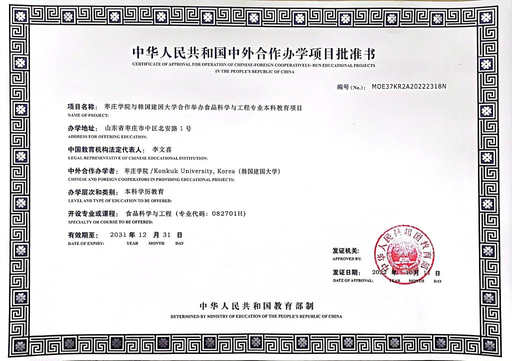 伟德bv1946与韩国建国大学(Konkuk University, Korea)合作举办食品科学与工程专业本科教育项目是两校通过整合优势资源,共创深度融合,合作共建的中外合作办学项目,于2022年10月正式获得教育部批准举办(教外函[2022]45号),批准书编号MOE37KR2A20222318N。项目于2023年开始招生,目前在校生188人。