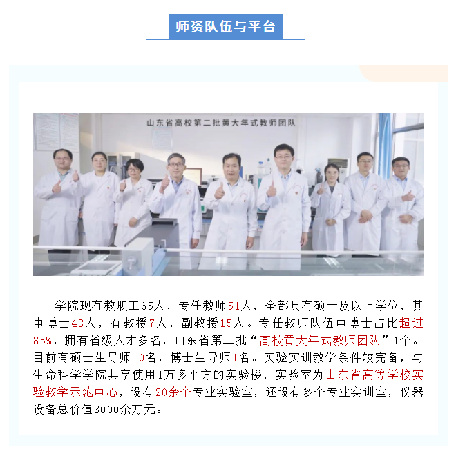 (2)办学成效明显。学校是省属全日制公办本科高校,拥有材料与化工、生物与医药2个硕士专业学位授权点。现有国家级本科专业综合改革试点专业1个,省级重点学科4个,山东省高水平应用型立项建设专业群4个、省级特色专业8个、省级一流本科专业11个;获批山东省一流本科课程20门、省级精品课程23门。