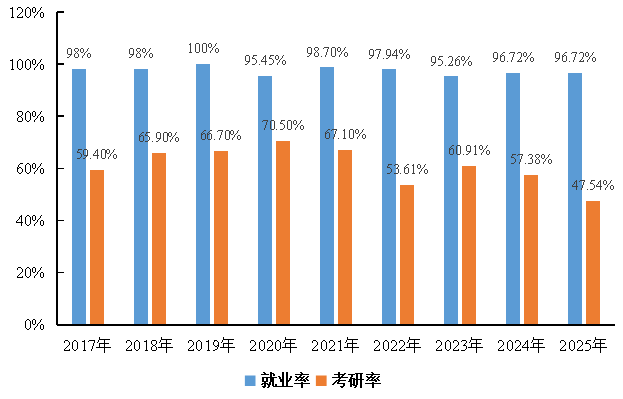 毕业学生在海关、食药监局、高等院校、青岛啤酒有限公司、山东六和集团、伊利集团等企事业单位,从事检验检测、生产管理、教学、科研等工作。历年就业率高于95%,近3年平均考研率超过55%。学生专业基础扎实,实践能力强,有责任感,综合素质高,普遍受到用人单位的欢迎。