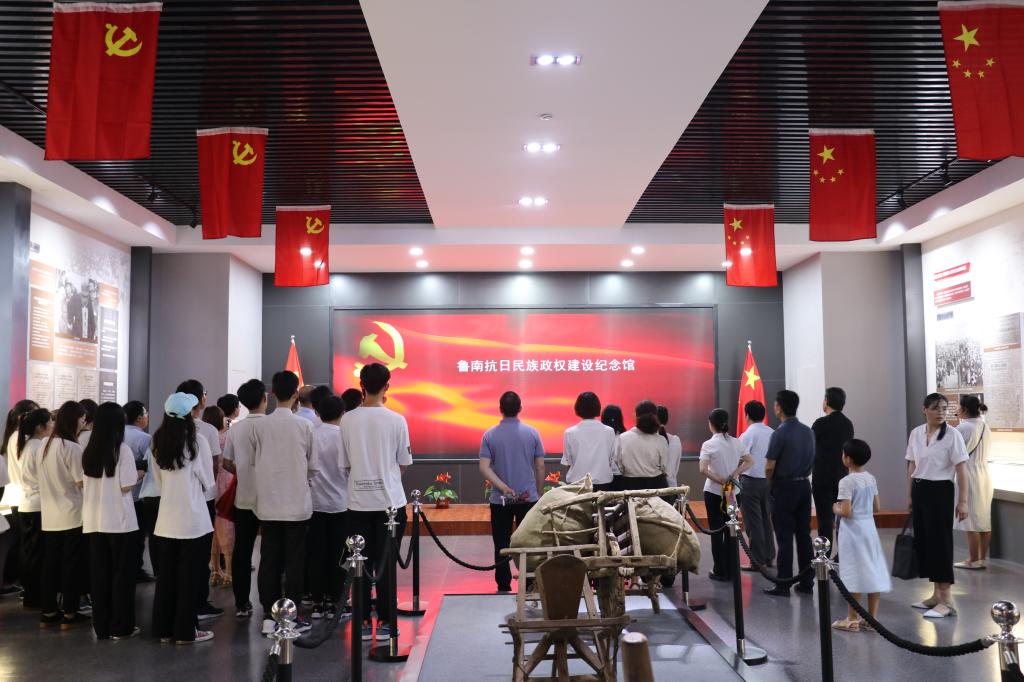 参观开始前,在鲁南抗日民主政权建设纪念馆大厅内,全体党员同志整齐排列,面向党旗,举起右拳,重温入党誓词,牢记初心使命,坚定理想信念。