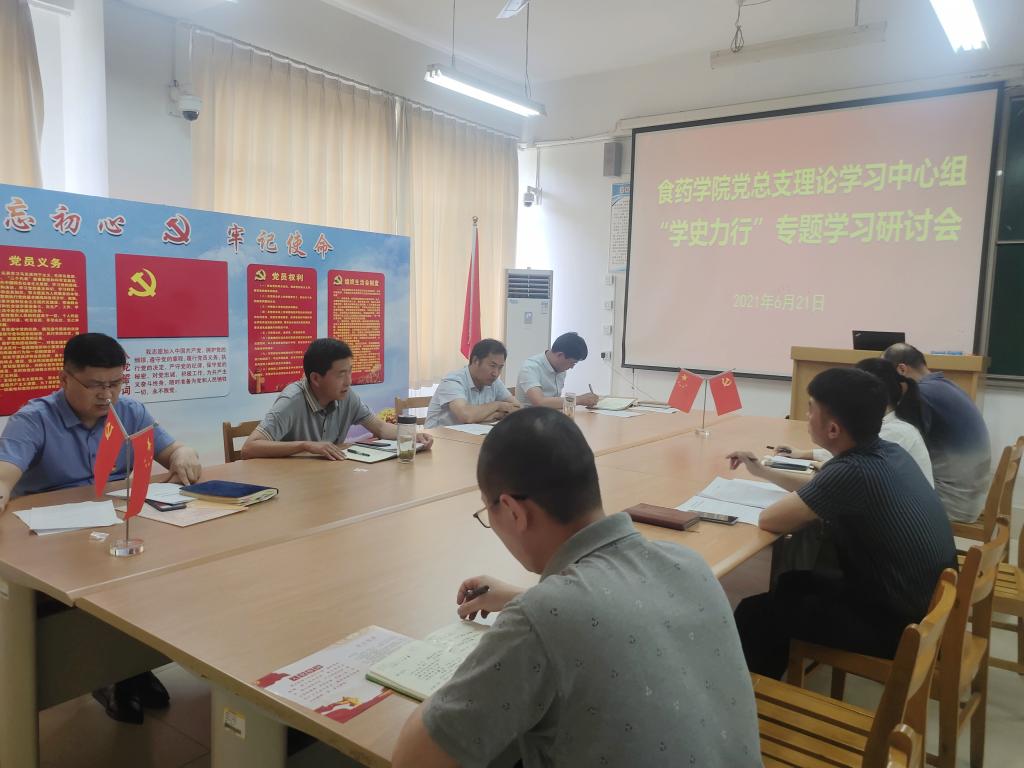 院长张立华指出,党史学习教育中,明理是前提、增信是保障、崇德是动力,力行才是最终目标。学史力行要深刻领悟坚持中国共产党领导的历史必然性;要铭记为人民谋幸福的初心;要牢记为民族谋复兴的使命;要不断开创新局面;要落实在干事创业的具体岗位上。现阶段,要将党史学习教育与学院工作紧密结合起来,增强干事创业的能力,以建设一流高水平应用型专业、培养创新型卓越工程技术人才为目标,以新旧动能转换、供给侧结构性改革为发展契机,以生物与医药学科硕士点建设为引领,以工程教育专业认证为抓手,树立新工科理念,走产教融合发展之路,不断深化教育教学改革,抓住大有作为的历史机遇期,振奋精神,凝心聚力,齐心协力,实干、快干,开创食药学院新局面。