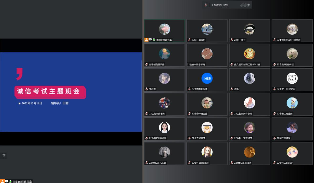 王京龙解读了学院期末线上考试工作方案,对“雨课堂或学习通”+“腾讯会议”双机位考试流程及注意事项进行了详细讲解,并要求每位学生做好应对线上考试的准备,遵守考场考试纪律,确保本学期期末考试能够顺利开展。随后,辅导员、班主任老师对同学们提出几点要求:一是要端正态度,充分诚信应考的重要性,把诚信作为践行诚信价值观的重要方式;二要提高思想警惕,杜绝任何侥幸心理,不给作弊留余地;三要积极备考,专心复习,稳扎稳打,以饱满的精神做好期末考试准备;四是科学应对考试焦虑,合理分配时间,保持平和而积极的心态,充分激发动力、理性化解压力。