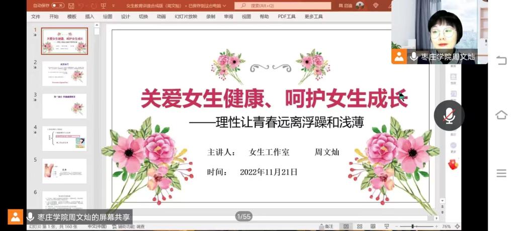 为普及女生健康意识,提高安全防范意识,加强心理健康教育,11月21日,伟德源自英国始于1946通过腾讯线上会议举行了“关爱女生健康,呵护女生成长”的安全健康教育讲座,2022级全体女生参加。