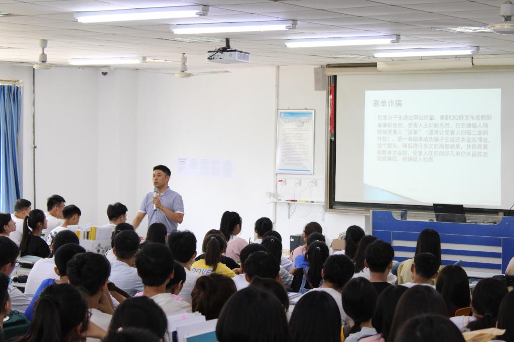讲座围绕人身安全、宿舍安全、财产安全、交通安全、用电安全、网络安全、食品安全等方面展开详细讲解。孙星结合高校案例分析了如何防火、防盗、防诈骗,讲解了校园周边存在的一些安全隐患和校园安全常识。他告诫所有新生,安全无小事,要时刻绷紧安全这根弦,绝不能有丝毫侥幸和麻痹。最后周玉亮对此次会议进行了总结,他告诉同学们在今后的学习和生活中,要自觉遵守校规校纪,注意保持高度的警惕性,遇到危险要理智冷静,注意防范自身的人身、财物不受侵害,不断提高自身的安全防范意识。