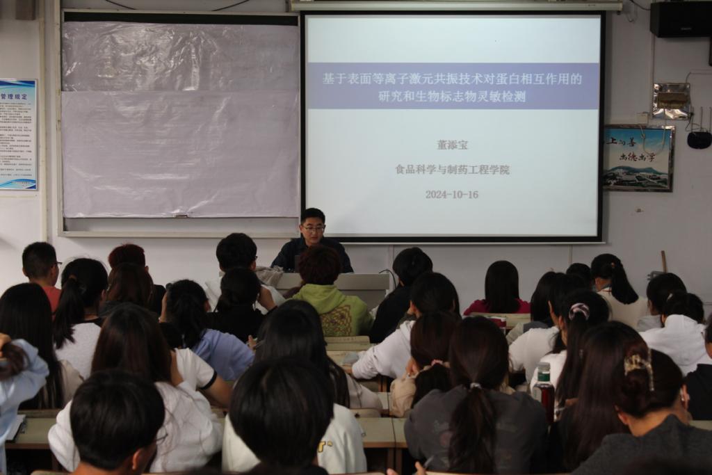 会上,董添宝题为“基于表面等离子激元共振技术对蛋白相互作用的研究和生物标志物灵敏检测”的学术报告。董博士以表面等离子激元共振技术的原理及其在生物标志物检测和蛋白相互作用研究中的应用展开介绍,展示了SPR技术在生物识别、药物筛选以及疾病诊断等领域的巨大潜力,并深入剖析了该技术在实际应用中所面临的挑战和解决方案。会后,董添宝与师生们进行了深入的交流,并就师生们提出的问题做出了耐心解答。“药物绿色合成团队”团队全体教师对此次报告会进行了专题交流研讨。