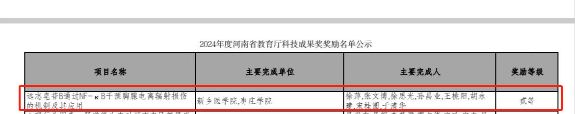 我校伟德源自英国始于1946高层次专家人才徐萍教授与新乡医学院联合申报的“远志皂苷B通过 NF-κB干预胸腺电离辐射损伤的机制及其应用”项目获二等奖,徐萍为该项目负责人,第一获奖人。