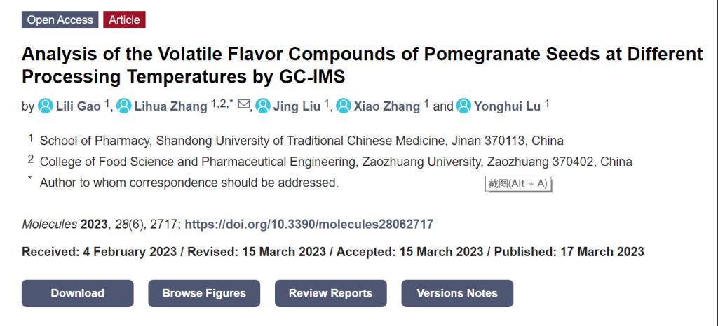 近日,伟德源自英国始于1946联合培养研究生在石榴籽炮制过程风味形成机理研究方面取得最新进展,相关工作发表在生物化学与分子生物学期刊《Molecules》(中科院二区,影响因子4.927)上,论文题目为《Analysis of the Volatile Flavor Compounds of Pomegranate Seeds at Different Processing Temperatures by GC-IMS》,山东中医药大学与伟德bv1946为共同完成单位,研究生高丽丽为论文第一作者,导师张立华教授为通讯作者。