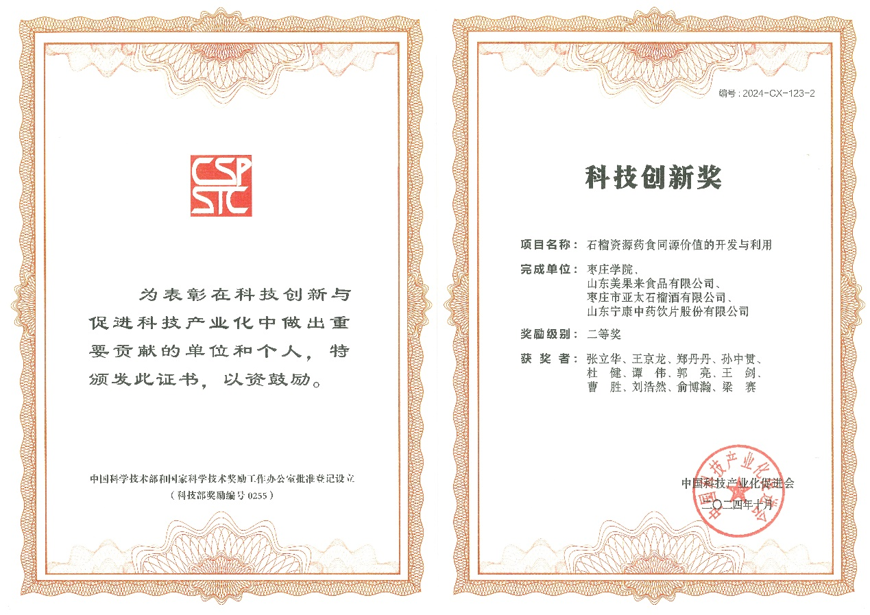 近日,第四届中国科技产业化促进会科学技术奖评审结果公示,国家林业草原石榴工程技术研究中心牵头完成的“石榴资源药食同源价值的开发与利用”荣获科技创新奖二等奖(奖励编号2024-CX-123-2)。