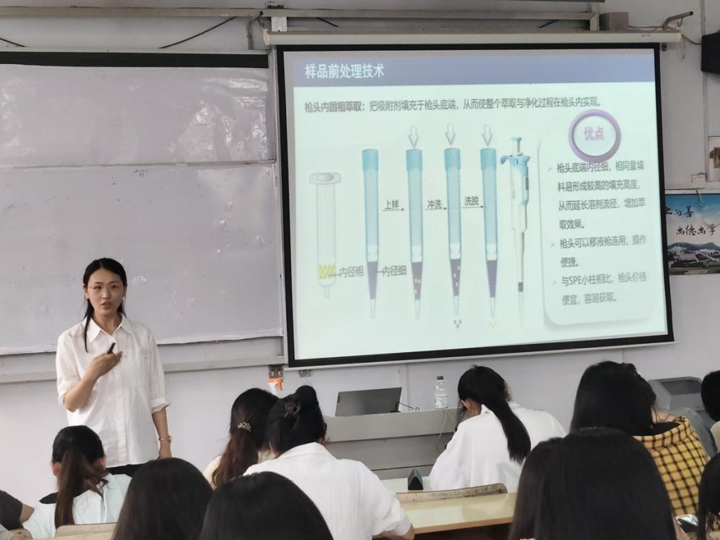 会上,李琳做了题为“基于金属有机骨架复合材料的样品前处理技术研究”的学术报告。李琳首先系统阐释了金属有机骨架复合材料的定义,对比分析了原位合成法与直接掺杂法的制备优势及工艺流程。并基于现有固相萃取存在的瓶颈问题,重点介绍了其开发的基于MOFs/纤维素气凝胶的枪头固相萃取和全自动化的MOFs/纤维素微球分散萃取两项创新技术在食品及环境样本痕量污染物检测中展现出的显著应用效能。会后,李琳与师生们进行了深入的交流,并就师生们提出的问题做出了耐心解答。“药物绿色合成团队”教师对此次论坛进行了专题交流研讨。